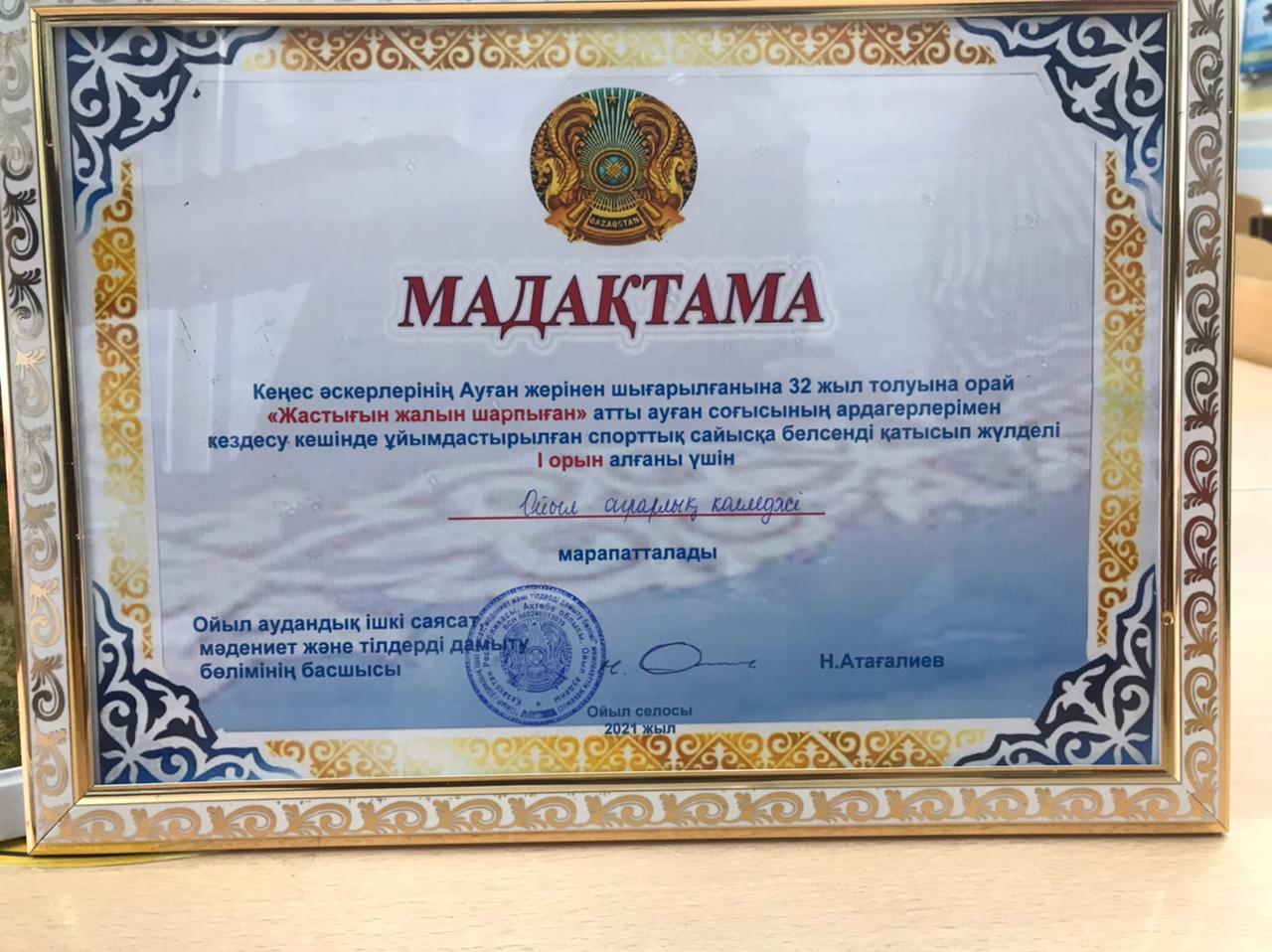 Кеңес әскерлерінің Ауған жерінен шығарылғанына 32 жыл толуына орай “Жастығын жалын шарпыған” атты ауған соғысының ардагерлерімен кездесу кешінде ұйымдастырылған спорттық сайысқа Ойыл аграрлық колледжі қатынасып, І орынға ие болды.