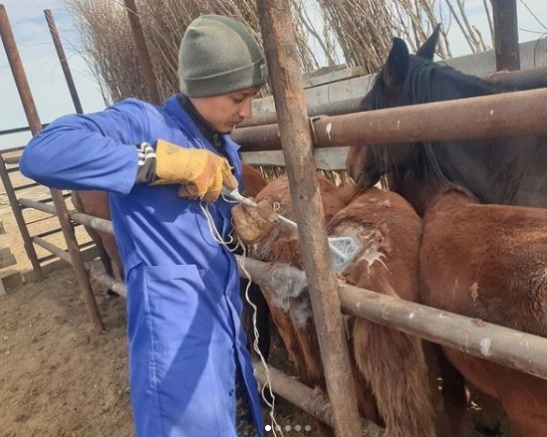Ветеринария мамандығының өндірістік оқыту шеберлері Ғасырбек Қарасайұлы, Ұлан Абайұлы, 4 курс студенттері “Асыланбек” шаруақожалығына барып, жылқыларға танба салып келді.