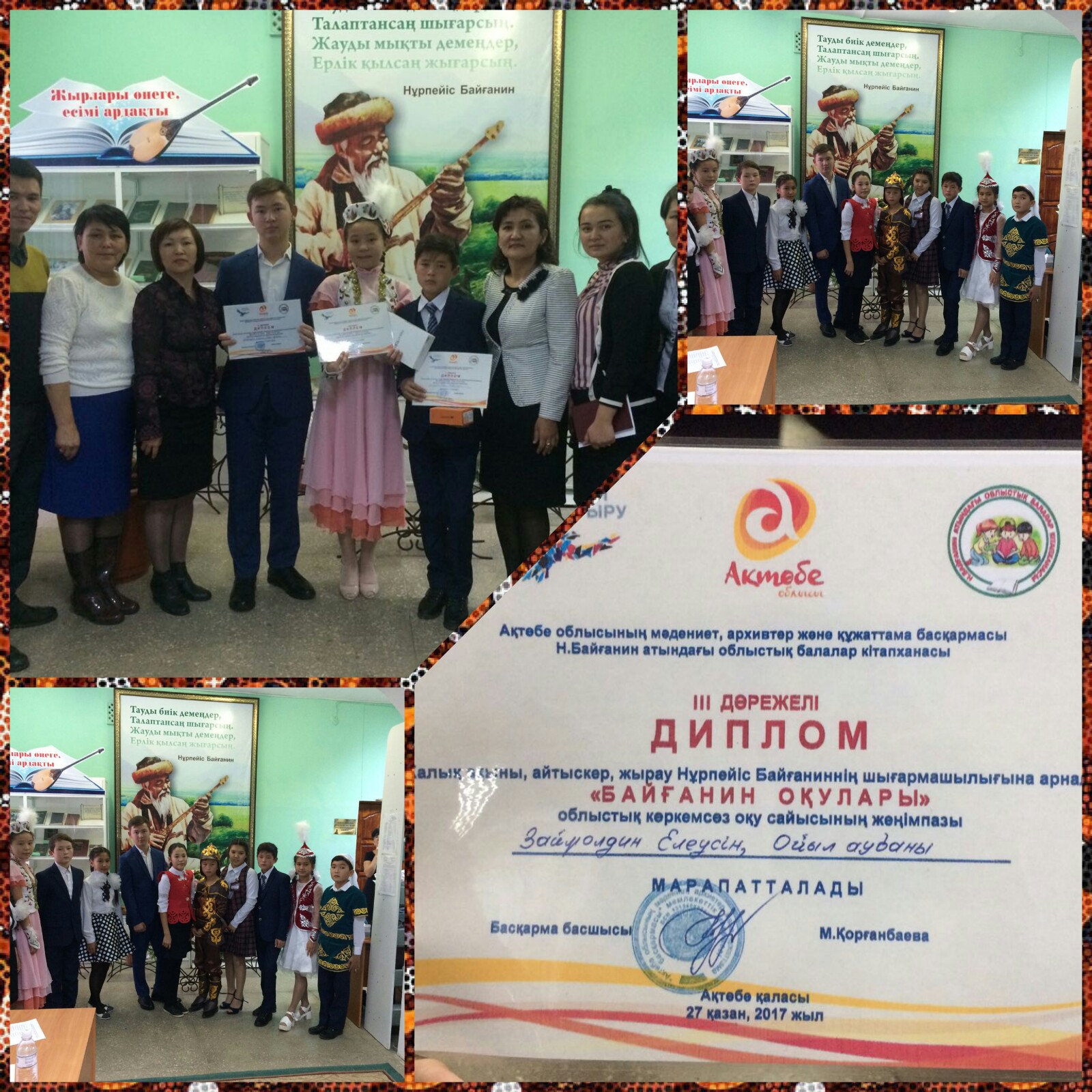 Ақтөбе облысының мәдениет, архивтер және құжаттама басқармасы , Н.Байғанин атындағы облыстық балалар кітапханасының ұйымдастырумен Халық ақыны, айтыскер, жырау Нұрпейіс Байғаниннің шығармашылығына арналған «Байғанин оқулары» облыстық көркем сөз оқу сайысына Ойыл аграрлық колледждің 1 курс студенті Займолдин Елеусин Сакенұлы қатысып, 3 орынға ие болды. Құттықтаймыз.